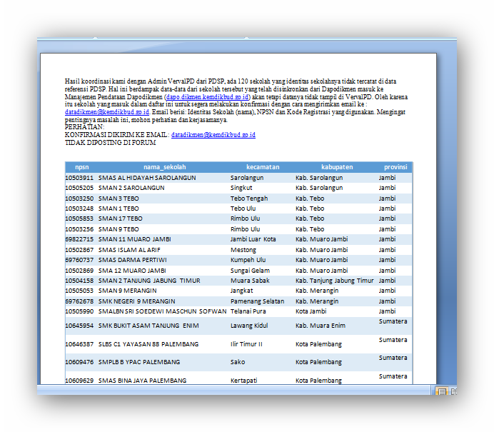 Hasil koordinasi dengan Admin VervalPD dari PDSP, ada 120 sekolah yang identitas sekolahnya tidak tercatat di data rujukan PDSP. Hal ini berdampak data-data dari sekolah tersebut yang telah disinkronkan dari Dapodikmen masuk ke Manajemen Pendataan Dapodikmen (dapo.dikmen.kemdikbud.go.id) akan tetapi datanya tidak tampil di VervalPD. Oleh alasannya ialah itu sekolah yang masuk dalam daftar ini untuk segera melaksanakan konfirmasi dengan cara mengirimkan email ke : datadikmen@kemdikbud.go.id. Email berisi: Identitas Sekolah (nama), NPSN dan Kode Registrasi yang digunakan. Mengingat pentingnya dilema ini, mohon perhatian dan kerjasamanya.